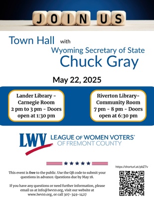 The League of Women Voters of Fremont County invite all to a Town Hall meeting with Secretary of State Chuck Gray on May 22, 2025.