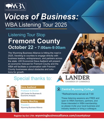 The Wyoming Business Alliance is hitting the road in 2025, traveling to counties to engage directly with business leaders, entrepreneurs, and partners across the state. UW Economist Dave Aadland will present an economic forecast for Fremont County and the WBA will facilitate a conversation with Fremont County businesses about obstacles and solutions for growth.
